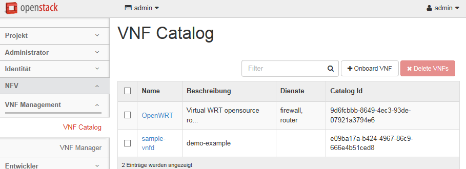 Die Tacker Funktionen können in OpenStack auf verschiedene Weise bedient werden. Für eine erste Orientierung ist deren Bedienung über die OpenStack-Oberfläche „Horizon“ unter dem Menüpunkt „NFV“ angeraten. Es gibt in der getesteten Variante nur die Menüeinträge „VNF Catalog“ (Abbildung 1) und „VNF Manager“ (Abbildung 2).