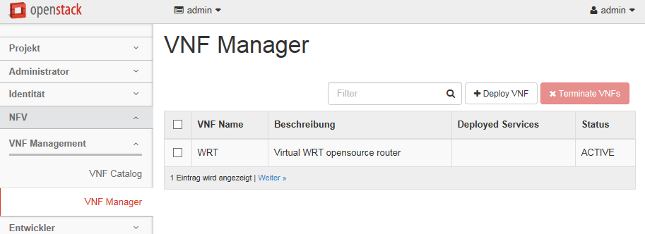 Beim VNF-Management werden die Bereitstellung (Deployment) und das Abschalten (Terminate) von VNF angeboten. Das Deployment erlaubt die Übergabe von Konfigurations-Parametern und – Werten in einer Datei oder in einem Eingabefeld. Zum Terminieren kann eine oder mehrere VNF ausgewählt werden.