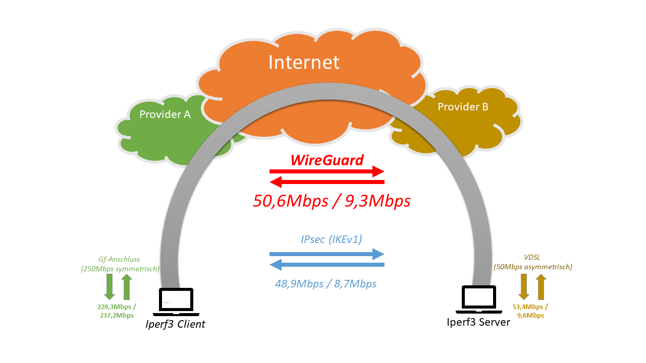 Um diese Gegenüberstellung in der Praxis nachzustellen habe ich einen iperf-Server und einen iperf-Client nacheinander mit einem IPsec IKEv1 und einem WireGuard Tunnel angebunden. Der iperf-Client lief auf einem virtualisierten Kali-Linux (Release 2022.4) in der WSL2-Umgebung auf meinem Windows 11 Notebook und war über eine symmetrische 250Mbit/s Glasfaser-Leitung an das Internet angeschlossen. Als Gegenstelle stand ein Raspberry 4 an einem asymmetrischen VDSL-Anschluss mit 50Mbit/s bereit, auf dem das Netzwerktool iperf3 im Server-Modus betrieben wurde. Natürlich ist solch ein stark vereinfachtes Testsetup für belastbare Performance-Messungen nicht geeignet, sondern gibt lediglich ein erstes Indiz für die Performanceunterschiede.