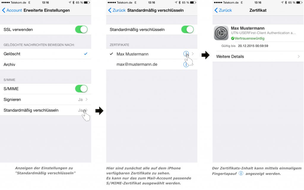 Hat man beides eingeschaltet, werden Mails immer signiert und wenn möglich verschlüsselt. Möglich ist das immer dann, wenn dem Smartphone das Zertifikat eines Mailkontaktes vorliegt, wie man das auch vom normalen Rechner her kennt. Das gilt natürlich für beide Seiten.