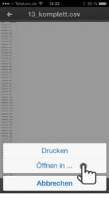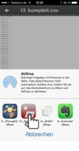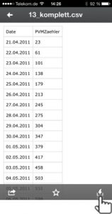 Die App SolarData registriert sich auf dem iPhone als Ziel-Applikation für die Verarbeitung von CSV-Dateien. Liegt eine CSV Datei z.B. in Mail, Dropbox oder einer anderen Anwendung vor, dann kann diese in der Regel über den „Öffnen in“ Standard-Dialog mittels SolarData geöffnet und verarbeitet werden.