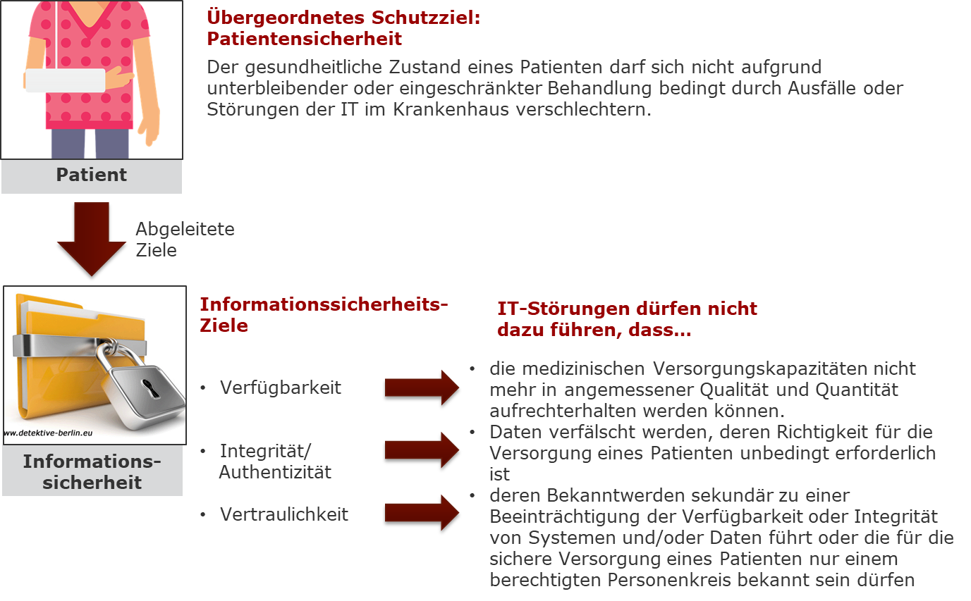 Werden die gängigen Schutzziele der Informationssicherheit (Verfügbarkeit, Integrität/Authentizität, Vertraulichkeit) mit den Zielen einer Gesundheitsorganisation, also der Patientensicherheit, kombiniert, ergibt sich ein neuer Blickwinkel auf das Thema Sicherheit.
